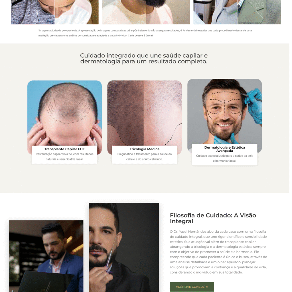 • Conteúdo Educativo: Informações detalhadas sobre procedimentos, como a técnica FUE de transplante capilar, são apresentadas de forma clara, ajudando os pacientes a tomarem decisões informadas.