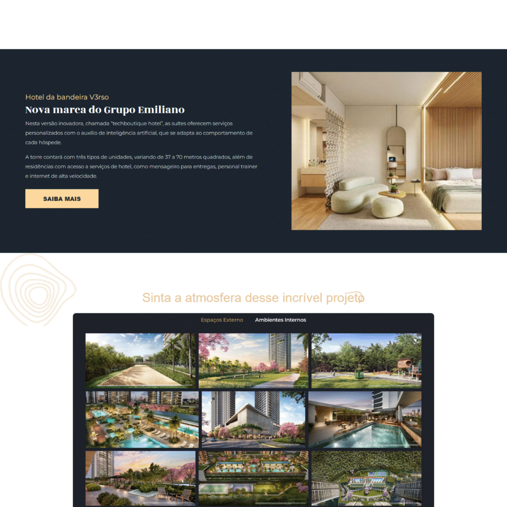 • Design Contemporâneo: A interface do site reflete a arquitetura sofisticada do empreendimento, utilizando uma paleta de cores elegantes e imagens de alta qualidade.